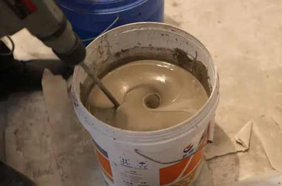 3、攪拌:用量水桶準確稱量適量清水(加水量嚴格控制在23%~25%之間),倒入30L以上的攪拌桶,再將1包自流平粉全部倒入攪拌桶,用大功率電鉆(700w以上)配專用攪拌頭以低速進行充分攪拌至均勻無結塊的稀糊狀即可(約 4~5min)。