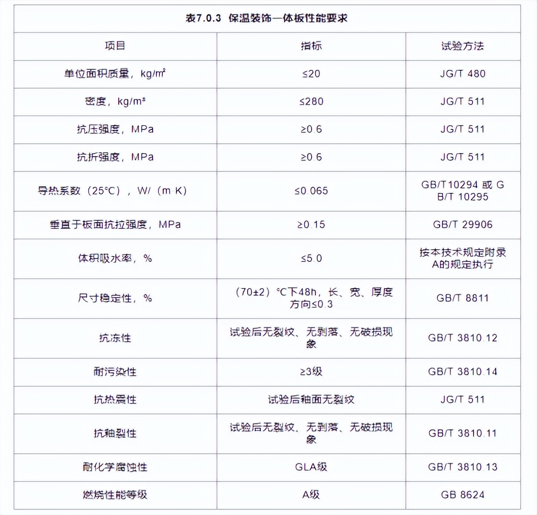 7.0.3 保溫裝飾一體板性能應(yīng)符合表7.0.3的規(guī)定