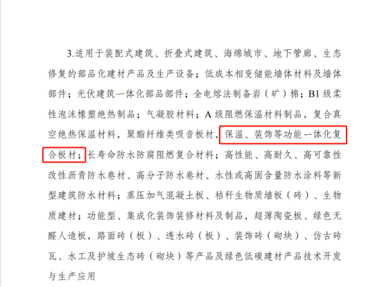 適用于裝配式建筑、折疊式建筑、海綿城市、地下管廊、生態修復的部品化建材產品及生產設備;低成本相變儲能墻體材料及墻體部件;光伏建筑一體化部品部件;全電熔法制備巖(礦)棉;B1 級柔性泡沫橡塑絕熱制品;氣凝膠材料;A 級阻燃保溫材料制品,復合真空絕熱保溫材料,聚酯纖維類吸音板材,保溫、裝飾等功能一體化復合板材;長壽命防水防腐阻燃復合材料;高性能、高耐久、高可靠性改性瀝青防水卷材、高分子防水卷材、水性或高固含量防水涂料等新型建筑防水材料;蒸壓加氣混凝土板、秸稈生物質墻板(磚)、生物質建材;功能型、集成化裝飾裝修材料及制品,超薄陶瓷板、綠色無醛人造板,路面磚(板)、透水磚(板)、裝飾磚(砌塊)、仿古磚瓦、水工及護坡生態磚(砌塊)等產品及綠色低碳建材產品技術開發與生產應用。